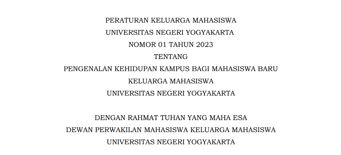 Peraturan baru ini ditetapkan di Sleman dengan judul Peraturan Keluarga Mahasiswa No 01 Tahun 2023 tentang PKKMB KM UNY, ditandatangani oleh Sukmawan Bayu Laksana sebagai ketua DPM KM UNY dan Afgan Ramadhan sebagai ketua BEM KM UNY, Rabu (17/5/23) pukul 22.07 WIB. Peraturan ini secara otomatis mengamandemen PKM UNY No 2 Tahun 2020 tentang PKKMB.